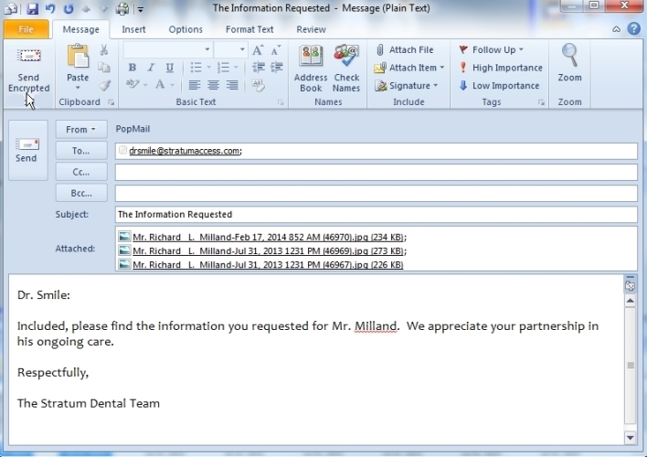 In fact, it couldn't be any easier. You and/or your staff simply click a 'Send Encrypted' icon instead of the standard 'Send' button -- and you have just forwarded patient health information within a secure,encrypted and password protected tool. It is THAT simple. Automated and integrated correspondence (patient statements, follow-up treatment correspondence, etc.) can also be -- built right in!